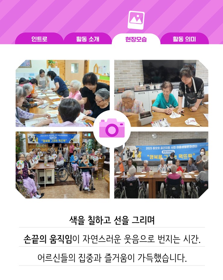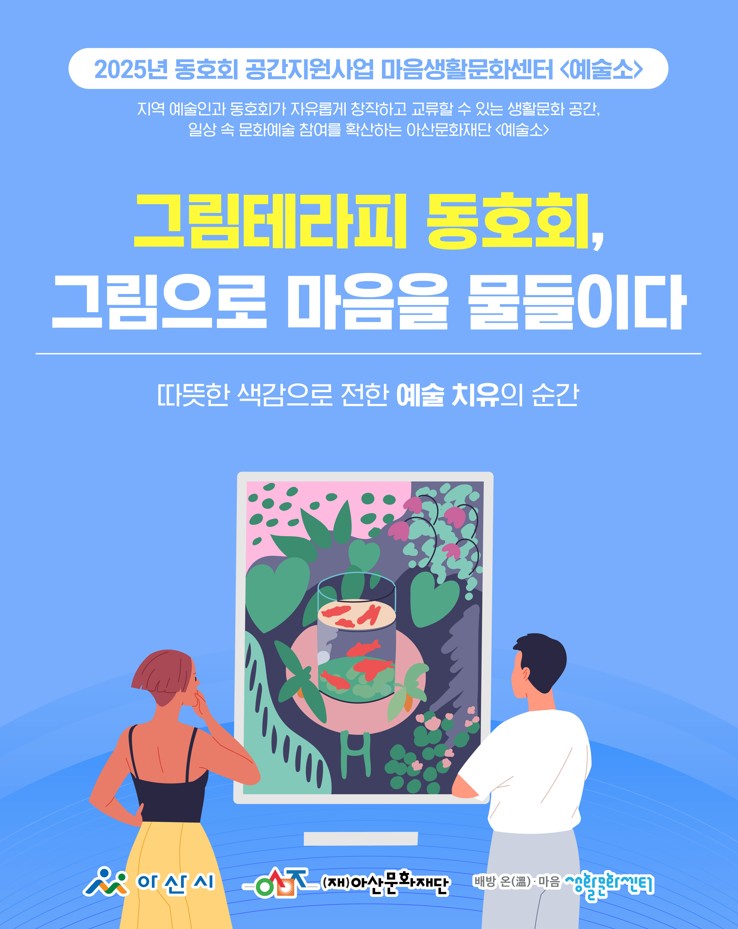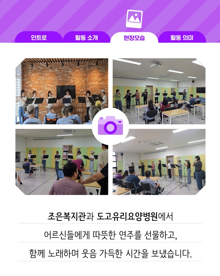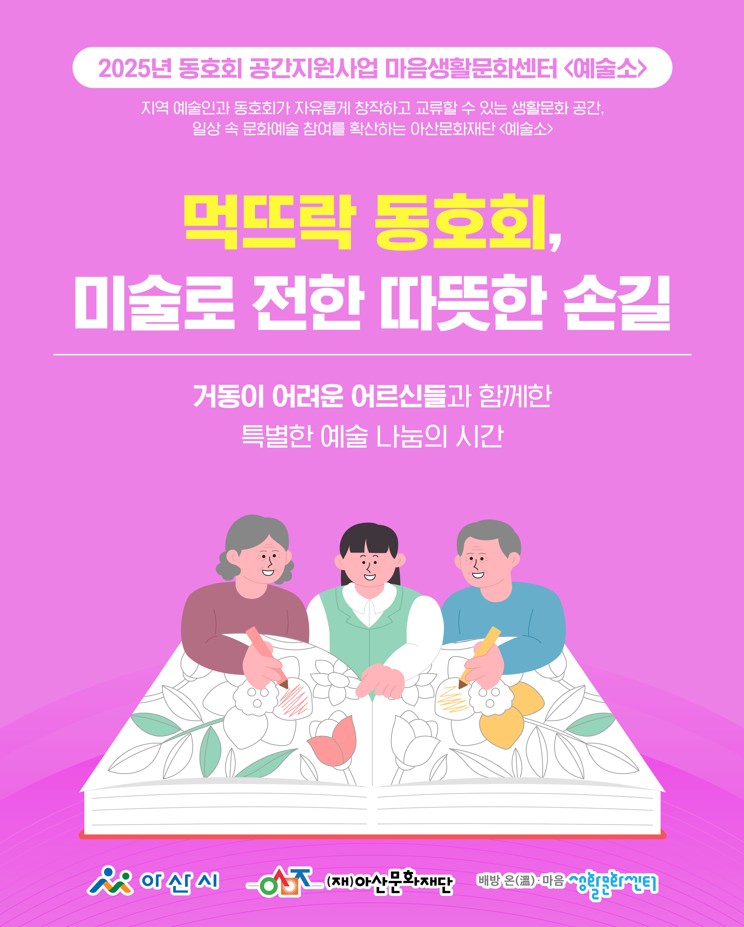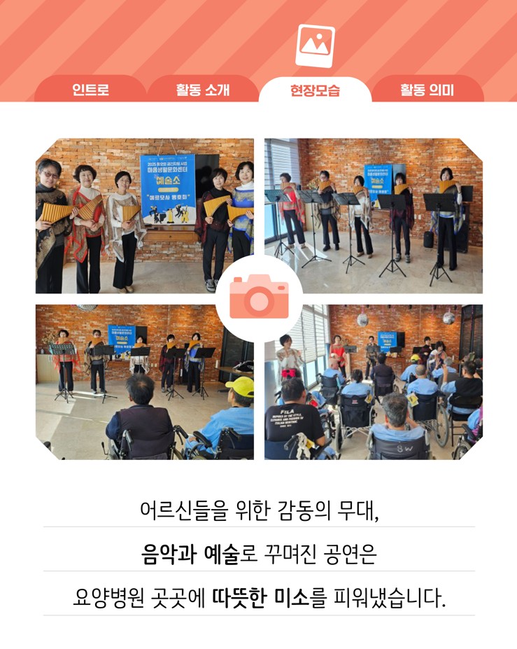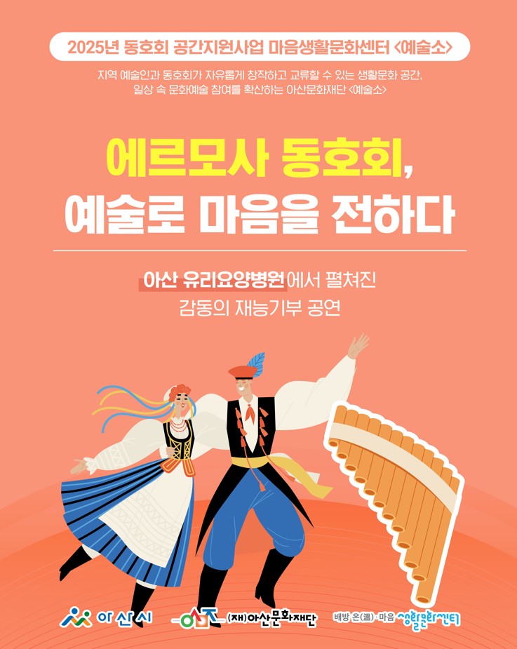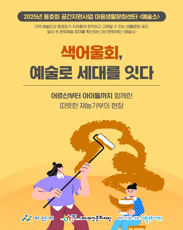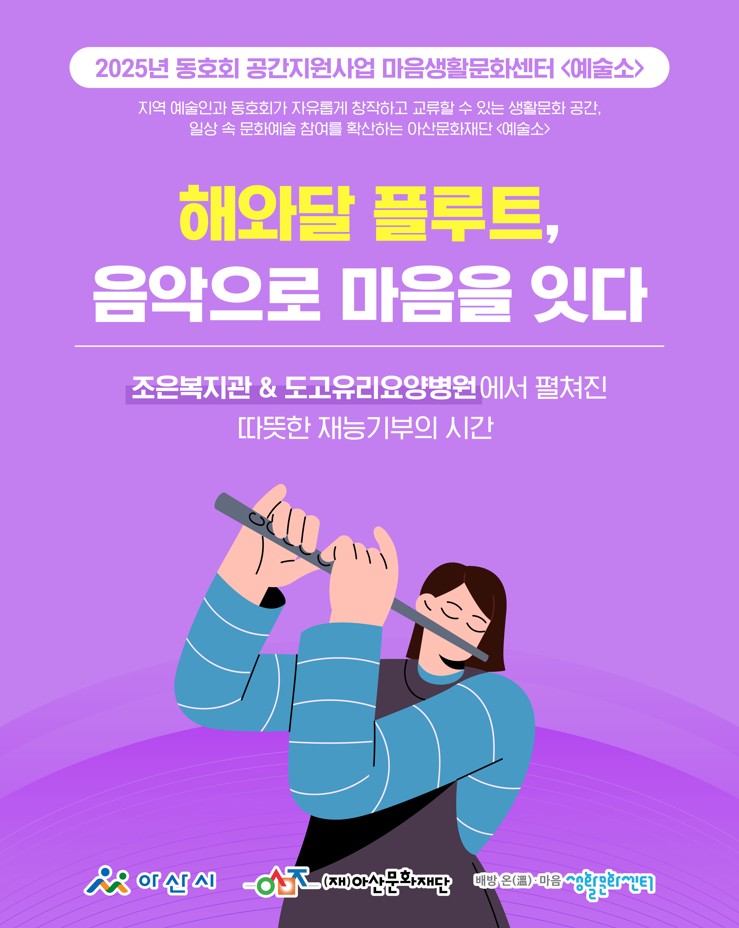 (재)아산문화재단 마음생활문화센터 <예술소>에 참여 중인 동호회들이 지역사회에 따뜻한 나눔을 실천했습니다. 회원들은 각자의 예술적 재능을 살려 복지기관, 요양시설 등에서 공연과 체험 프로그램을 운영하며 시민들과 함께하는 생활문화의 가치를 전했습니다.