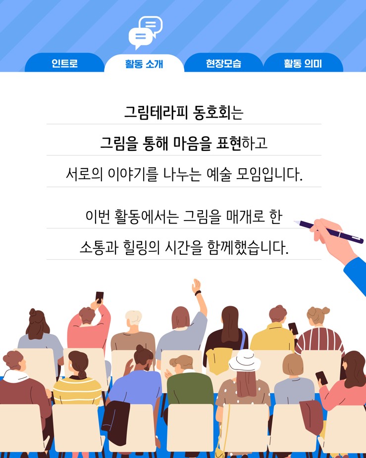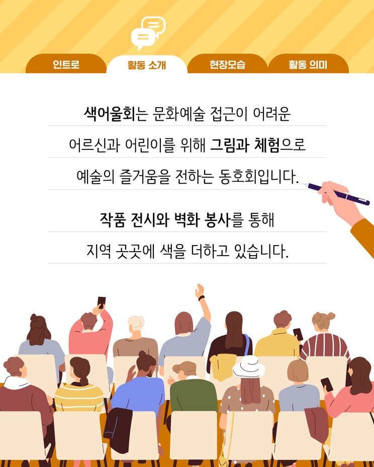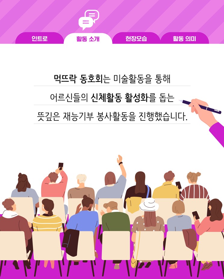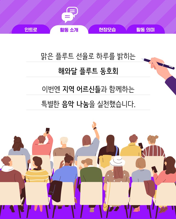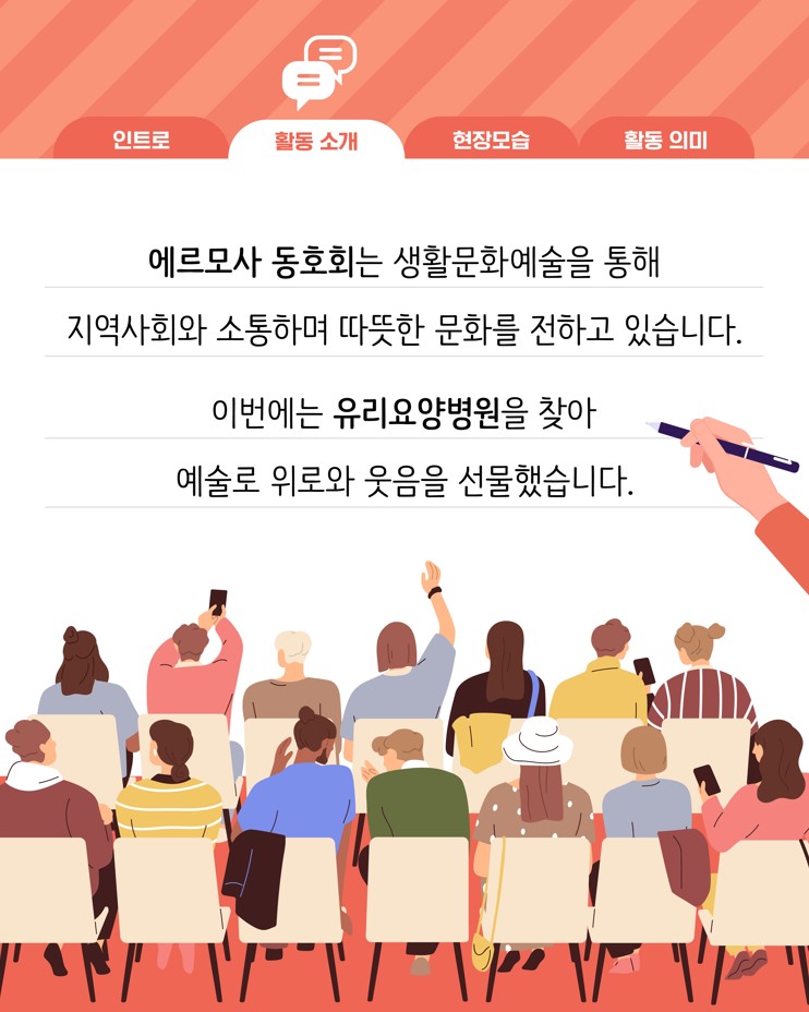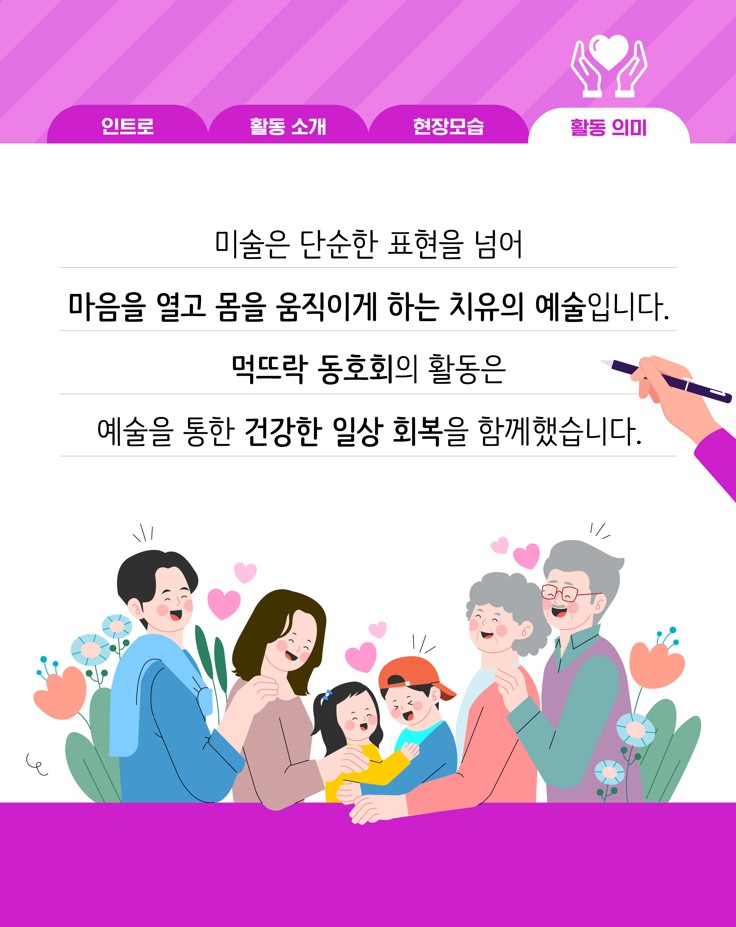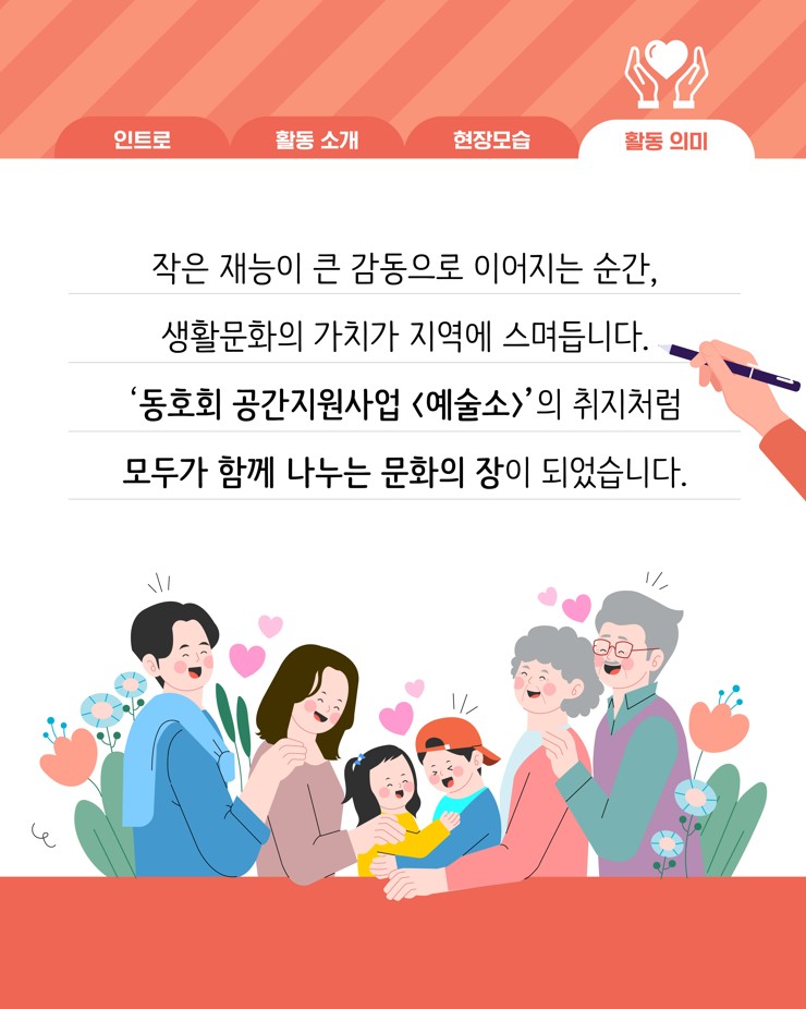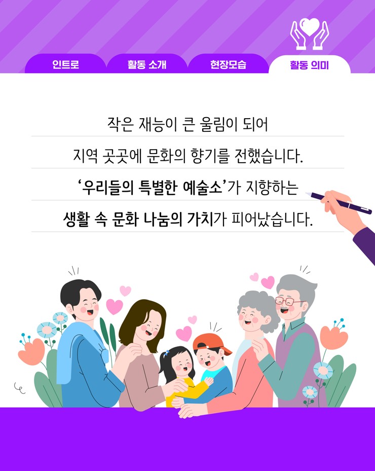 (재)아산문화재단 마음생활문화센터 <예술소>에 참여 중인 동호회들이 지역사회에 따뜻한 나눔을 실천했습니다. 회원들은 각자의 예술적 재능을 살려 복지기관, 요양시설 등에서 공연과 체험 프로그램을 운영하며 시민들과 함께하는 생활문화의 가치를 전했습니다.