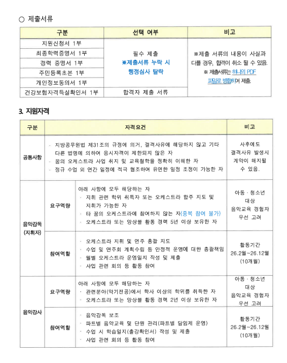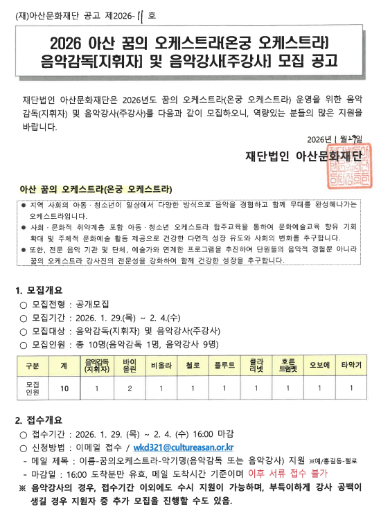 (재)아산문화재단은 2026 꿈의 오케스트라 음악감독, 음악강사를 다음과 같이 모집합니다.