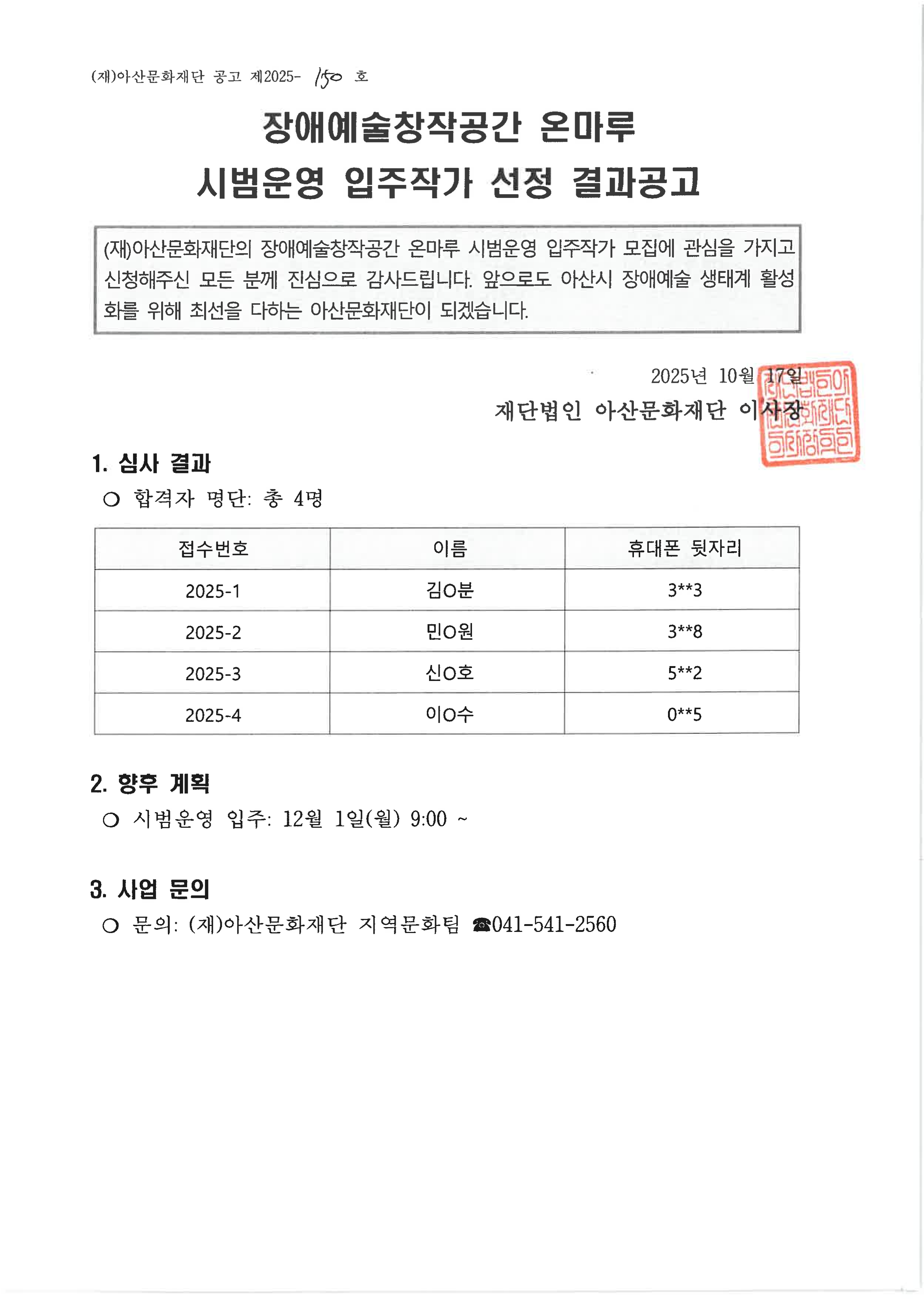 장애예술창작공간 온마루 시범운영 입주작가 선정 결과 공고